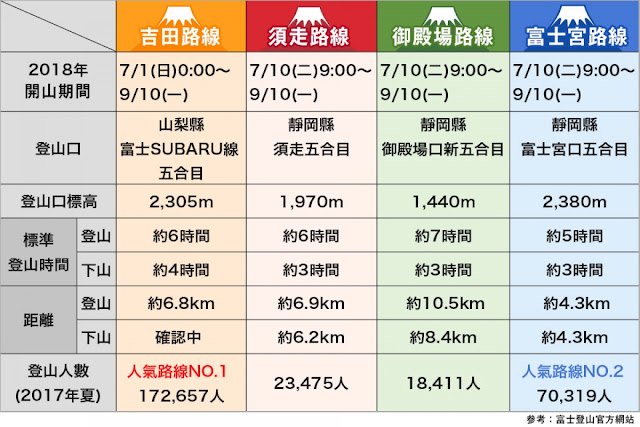 富士山登頂一共有四條路線可以選擇(下圖) |